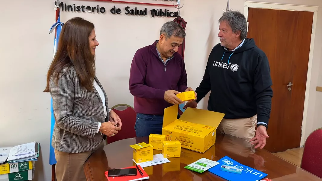 En Casa de Gobierno, el ministro de Salud Pública, Federico Mangione, junto a la subsecretaria de Medicina Social, Gabriela Dorigato, recibieron al Especialista en Salud y Desarrollo Infantil Temprano de UNICEF, Javier Quesada, quien entregó de manera simbólica el donativo de parte del organismo internacional.