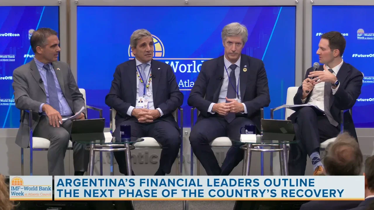 El ministro de Economía, Luis Caputo, junto al presidente del Banco Central (BCRA), Santiago Bausili, participaron del Atlantic Council, dentro de las reuniones anuales del Fondo Monetario Internacional (FMI) y el Banco Mundial, donde respaldaron el acuerdo financiero con Estados Unidos tras la reunión de los presidentes Javier Milei y Donald Trump.